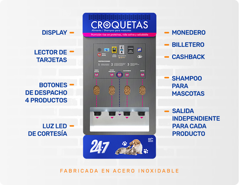 Tus clientes siempre encontrarán croquetas y shampoo para mascotas incluso cuanto negocio esté cerrado. Tú solo reabasteces y la máquina hace el resto.